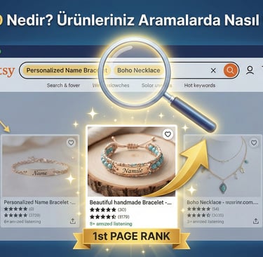Etsy algoritması ürünlerinizi müşterilere relevans (uygunluk) seviyesine göre gösterir. Yani kullanılan anahtar kelimeler, başlık yapısı, açıklama metni ve etiketler ürününüzün ne kadar doğru eşleşme aldığını belirler. Eğer ürününüz aranılma terimleriyle uyuşuyorsa, görünürlüğünüz yükselir ve satış ihtimaliniz kat kat artar.